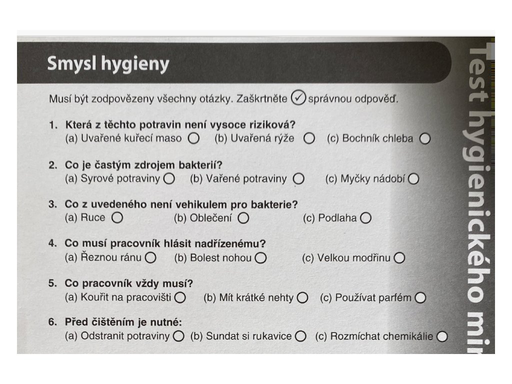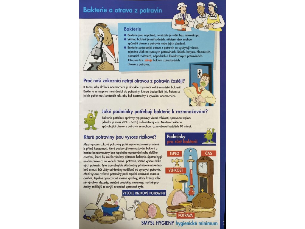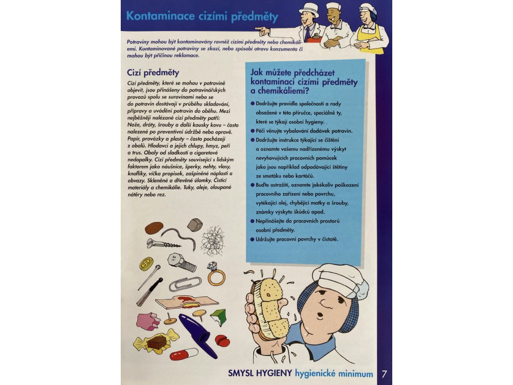 Brožura má celkem 16 stran a jednostránkový vložený test hygienického minima, který lze využít jako záznam o proškolení pracovníka. Publikace je bohatě ilustrovaná a jednoduchým názorným způsobem vysvětluje témata jako je politika bezpečnosti potravin, bakterie a otrava z potravin, rizikové potraviny, bakteriální, chemická a fyzikální kontaminace potravin, hygiena a zdravotní stav, čištění a dezinfekce, správná praxe při manipulaci s potravinami, kontrola škůdců, dodržování teplotního řetězce atd.